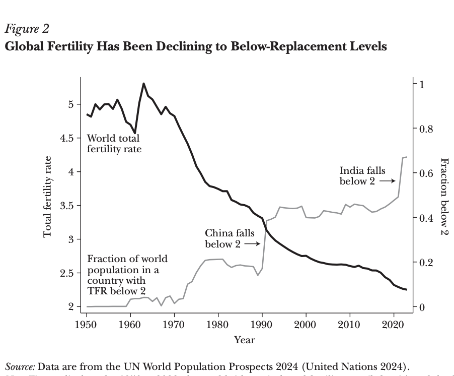 "As long as birth rates hold at any level below two children per two adults—even at some steady, unchanging level—the slide down would continue indefinitely. ... These projections raise the questions that are the focus of this article: Is this sort of future, in fact, likely? Could low birth rates persist? The facts and evidence that we present here indicate that sustained global depopulation is a likely possibility."